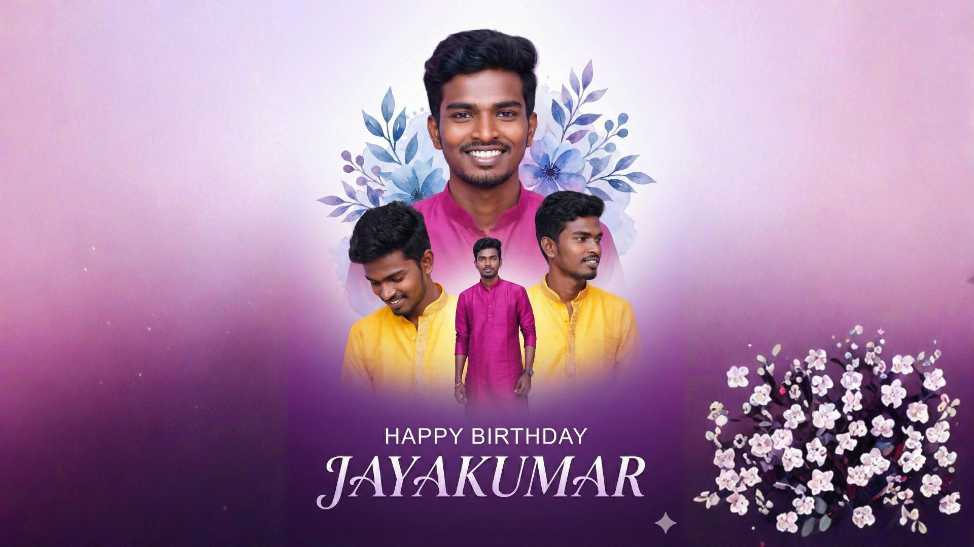 “A dreamy and elegant digitalbirthday greeting card featuring a beautiful young man . The background consists of a soft, vertical gradient transitioning from a very light lavender or white at the top to a richer, darker purple at the bottom. Multiple instances of the woman are arranged in a dynamic, overlapping collage. The most prominent image is a large, smiling bust shot in the upper center, where she is wearing a solid pink or magenta top. Below and around this main image, three other images of the woman are positioned, also wearing variations of yellow or magenta traditional Indian huddy.