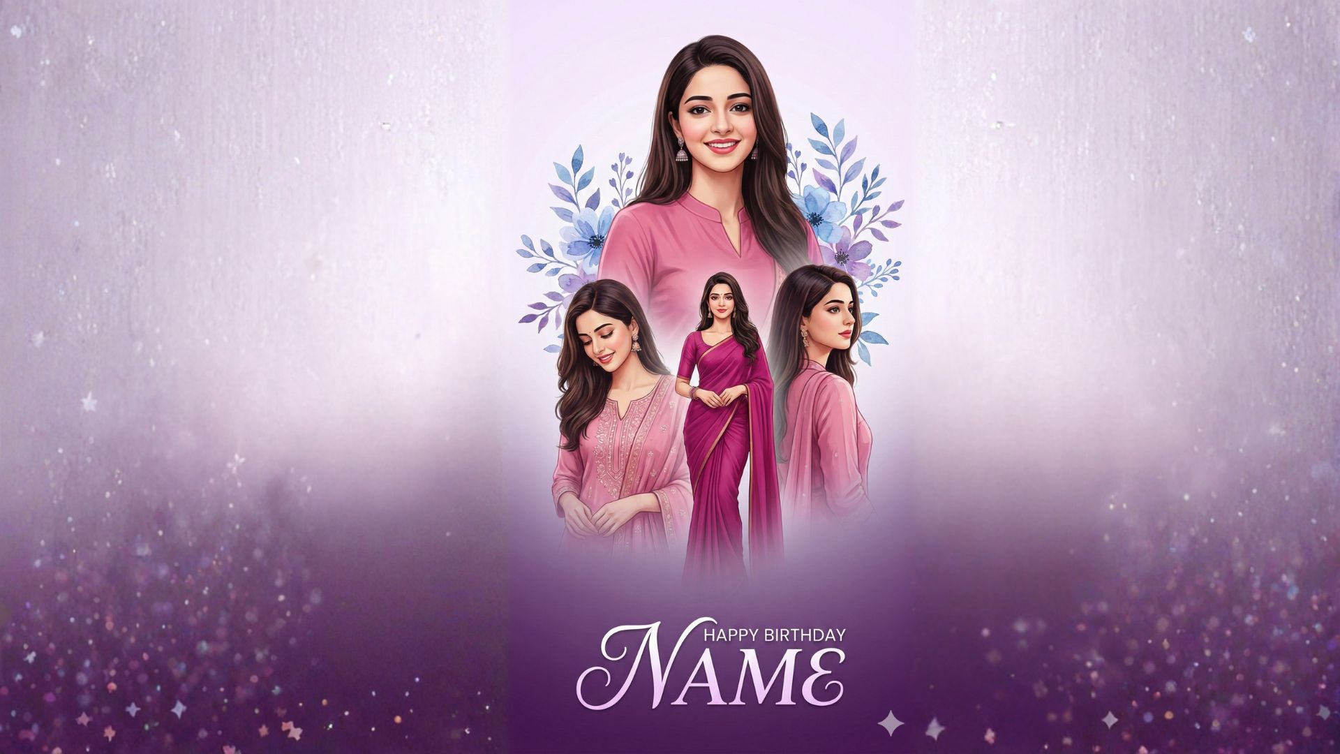 Below and around this main image, three other images of the woman are positioned, also wearing variations of pink or magenta traditional Indian attire (possibly a kurti and dupatta or sari). These images capture her in different poses:one looking down with a gentle smile, one standing confidently, and another looking to the side with a slight smile. The edges of these collage elements are softly blended. Interspersed within the upper part of the background, there are artistic, watercolor-style floral and leaf elements in shades of blue and purple, subtly framing the top main image. At the very bottom of the card, in smaller, clean white text, itreads ‘HAPPY BIRTHDAY’.